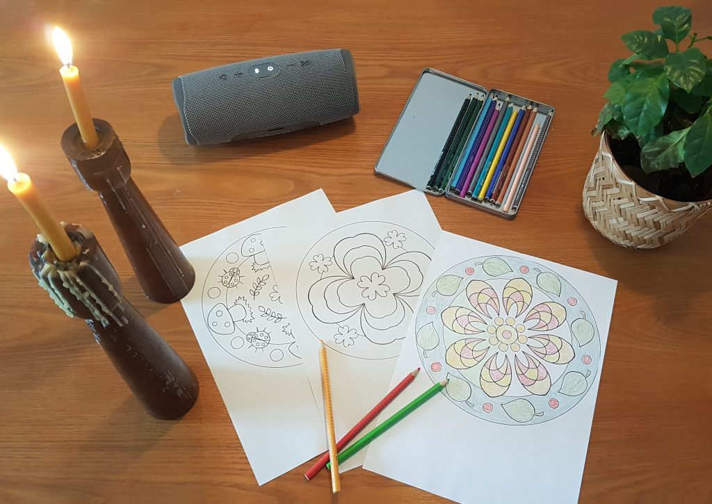 - Setz Dich hin und male. Wenn es Dich im Körper kribbelt oder Dein Gedanken-Karussel anspringt, hör der Musik genau zu oder versuche, beim Ausmalen ganz genau zu sein.