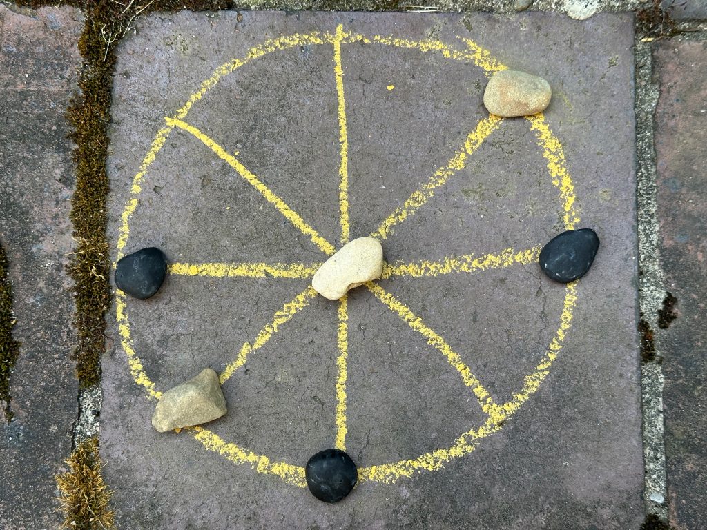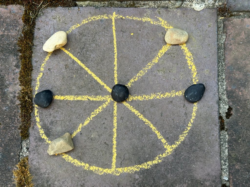 - Für die Römermühle malt Ihr Euch dieses Spielfeld auf ein Papier, zeichnet es mit einem Stöckchen in den Sand oder auch mit Kreide auf den Boden. (Die Römer*innen haben es auch in Stein gemeißelt.)