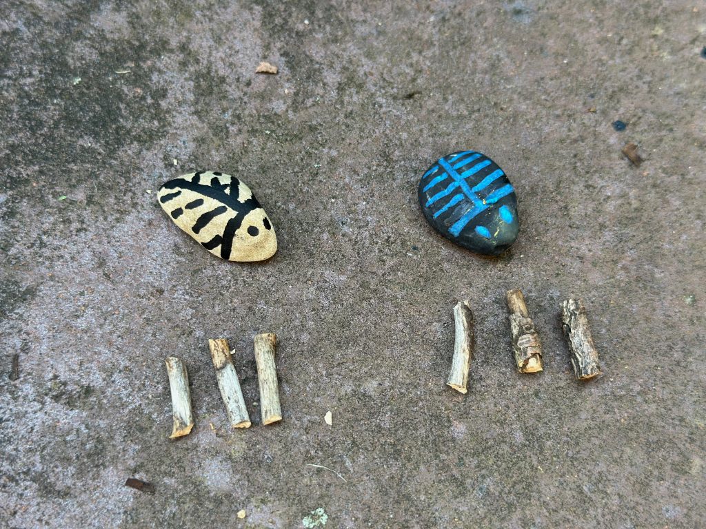 - Drei weiße Steine und drei schwarze Steine (oder Ihr malt die Steine in zwei unterschiedliche Farben an)