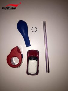 Um den Wagen zum Fahren zu bringen, müsst Ihr nur noch den Luftballon durch den Strohhalm aufblasen. Haltet den Strohhalm mit Euerm Finger solange zu bis Ihr Euern Wagen in die Startposition gesetzt habt. Zum Starten lasst Ihr den Strohhalm los und schon beginnt das Rennen.