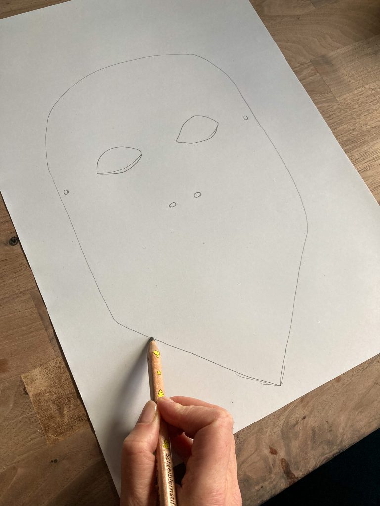 Zunächst zeichnet Ihr auf dem weißen Tonpapier die Umrisse Eurer Bauta vor. Ihr könnt vorab Skizzen zeichnen bis Ihr die für Euch passende Form gefunden habt. Wichtig ist, dass Mund und Nase bei der traditionellen weißen Bauta-Maske verdeckt und nur die Augen frei sind. Zudem ist das Kinn meist verlängert und spitz dargestellt.