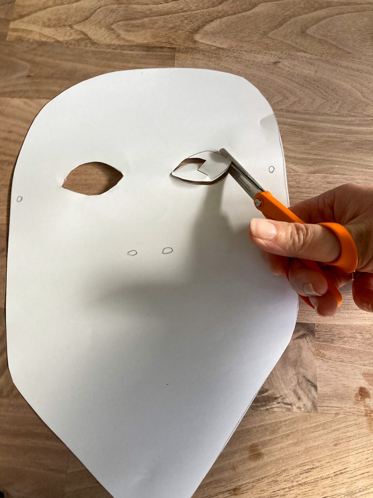 Wenn Ihr Eure Form gefunden und auf das Tonpapier übertragen habt, schneidet Ihr dieselbe aus. Damit Ihr auch unter der Maske genügend Luft bekommt, schneidet Ihr kleine Luftlöcher an den Stellen aus, die Eure Nasenlöcher verdecken.