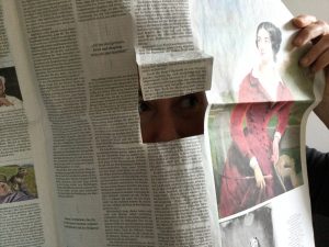 Schneidet eine Luke in eine Zeitung und klappt sie unauffällig nach oben.