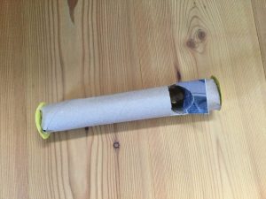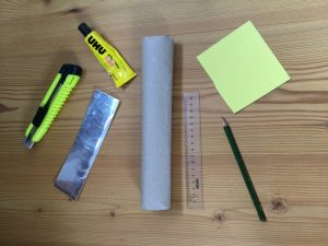 Schneidet in die Pappröhre an jedes Ende ein viereckiges Loch. Klebt dann zwei Stücke Spiegelfolie schräg in die Löcher. Das geht am besten, wen Ihr die Innenseite der Folie rund schneidet.