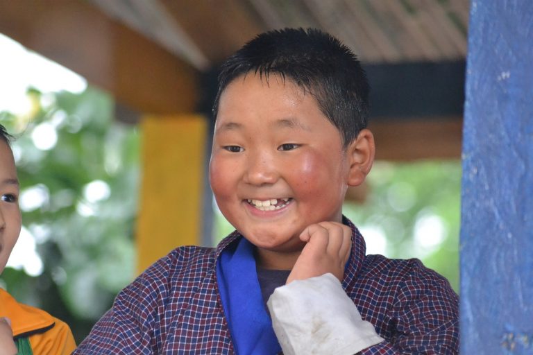 Auch wenn es in Bhutan Schulen gibt und das Land sich für ein kostenloses Schulsystem für alle einsetzt (Unterrichtssprache ist übrigens Englisch, aber auch die Landessprache Dzongkha wird gelehrt) sind die Bedingungen für ein gutes Schulsystem schlecht, weil dem Staat das Geld fehlt. Viele Kinder haben sehr weite und beschwerliche Schulwege. Und es fehlt an gut ausgebildeten Lehrkräften, Möbeln, Toiletten und Schulmaterial, wie Schulbücher. Noch dazu können viele Kinder die Schule nicht besuchen, da sie zuhause mithelfen müssen. Viele Familien leben in einfachen Verhältnissen, auch wenn das buddhistische Königreich am Rande des Himalaya Gebirges in den letzten Jahren eine tolle Entwicklung im Sozialen und Wirtschaftlichem gemacht hat, ist das Land leider immer noch arm. Das Land war lange Zeit isoliert und nahm am technischen Fortschritt erst spät teil, bspw. das Fernsehen und Internet gibt’s erst seit dem Jahr 1999. Heute haben 87% der Bevölkerung ein Mobiltelefon und es gibt inzwischen ca. 600 Schulen. Immerhin werden derzeit 89 von 100 Kindern eingeschult. Leider müssen viele Familien eines oder mehrere ihrer Kinder in Klosterschulen geben, damit es oder sie versorgt wird bzw. werden. Weg von den Eltern ist der Alltag für die kleinen Mönche dort oft sehr hart! Auch wenn fast alle Familien in Bhutan genügend zu essen haben, kommt es bei 9 von 10 Kindern unter 2 Jahren doch zu Mangelernährung. Das bedeutet, dass diese Kinder nicht ausreichend Vitamine und Nährstoffe bekommen, um gesund wachsen zu können. Und trotzdem sind die Kinder dort oft fröhlich und zufrieden und lachen viel!
