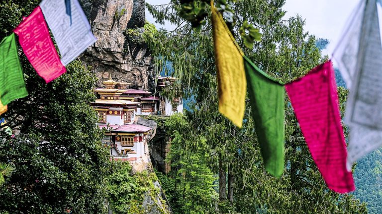 - Die Menschen in Bhutan leben in einfachen Verhältnissen, sind aber sehr zufrieden mit dem was sie haben. Sicher macht sie auch der starke Bezug zu ihrem Glauben so zuversichtlich und zufrieden. Denn die Mehrheit der Menschen in Bhutan sind Buddhisten. Buddhistische Werte wie Einfachheit und Mitgefühl, Gemeinschaft und Gastfreundlichkeit sind dabei ganz wichtig. Die Menschen halten zusammen, es gibt sehr viele Zeremonien, Riten und Rituale. Bhutan ist ein spirituelles Land, das Streben nach Innerem Frieden und Achtsamkeit ist sehr bedeutend. Hunderte von heiligen Klöstern (das berühmteste ist das Tigernest, Bild s. unten), Gebetsfahnen und – Mühlen sind im ganzen Land verteilt und tragen zur spirituellen Atmosphäre bei, die das Wohlbefinden der Menschen steigert.
