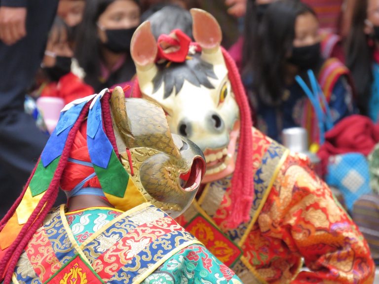 - Es werden sehr viele Feste gefeiert und viele Festivals veranstaltet, wie beispielsweise Masken- und Tanzfestivals (Tsechu). Traditionen wie das Tragen eines Gho für Männer (=karierter oder gemusterter bademantelartiger Umhang) und einer Kira für Frauen (= knöchellanges gewickeltes Kleid) sowie traditionelles Essen (Nationalgericht Datshi = Chilli-Käse-Eintopf, Hauptnahrungsmittel ist übrigens Reis/Nationalgetränk Suja= Buttertee) werden geehrt und bewahrt. Es ist sehr wichtig, freundlich, nett und höflich zueinander zu sein, denn das schafft ein unterstützendes und verbindendes Umfeld, was zum Zugehörigkeits- und Glücksgefühl beiträgt.