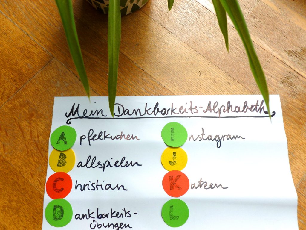 Jetzt geht der Spaß los: Versuche, zu jedem Buchstaben eine Sache, eine Person oder ein Erlebnis zu finden, wofür Du dankbar bist.