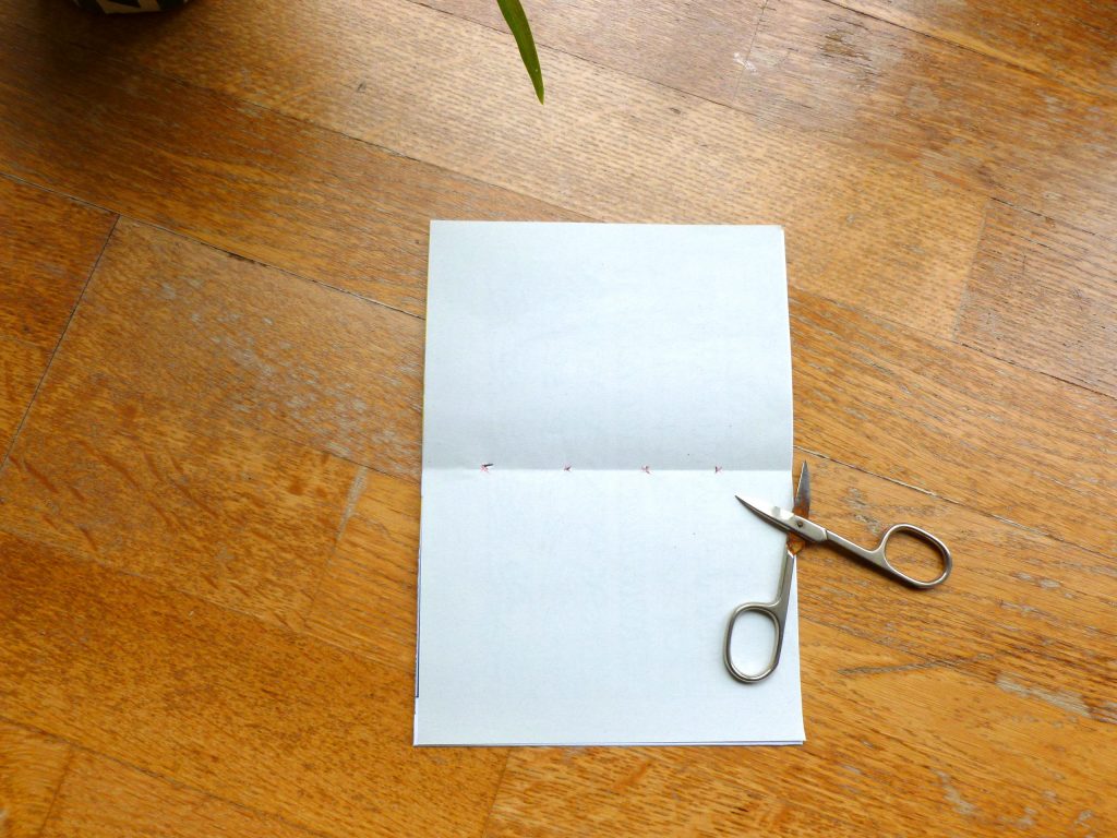 3. Falte das Büchlein wieder auf und markiere Dir 4 Punkte auf der Mittellinie. Hier werden mit der spitzen Schere 4 Löcher durch alle Schichten gebohrt. Lass Dir damit am besten von jemand Großem helfen.