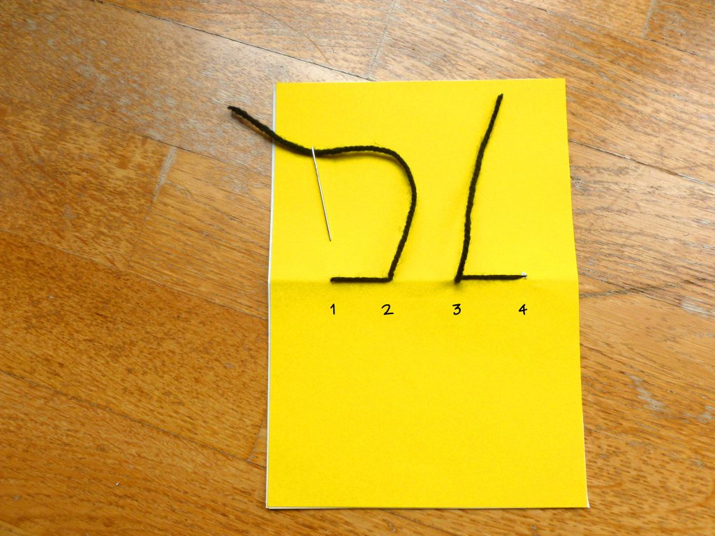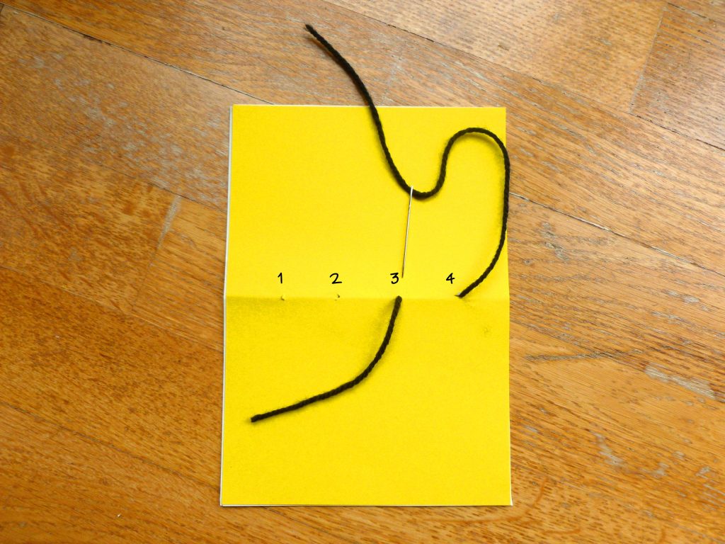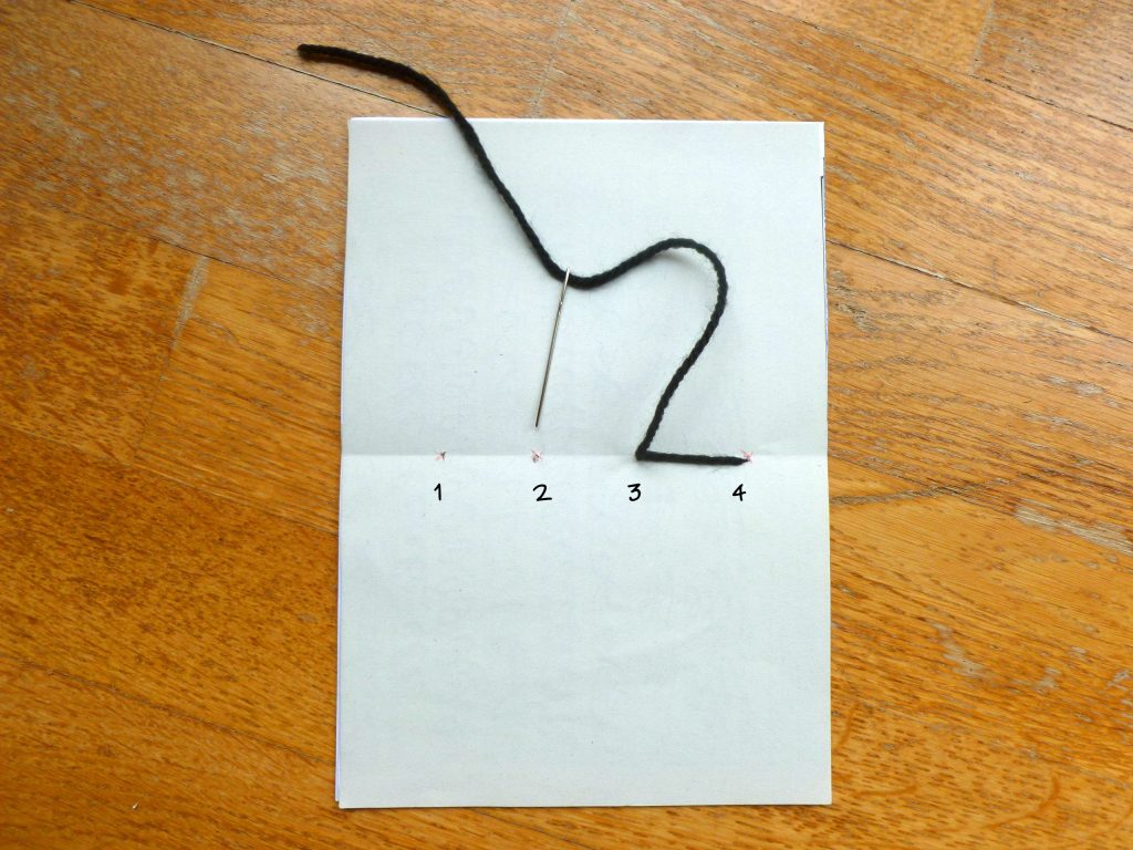 Leg das Buch aufgeklappt und Hochkant vor Dich hin. Als erstes stichst Du von außen in das 3. Loch ein. Lass ein gutes Stück Faden überstehen. Dann stichst Du beim 4. Loch wieder raus, und nochmal beim 3. Loch ein.