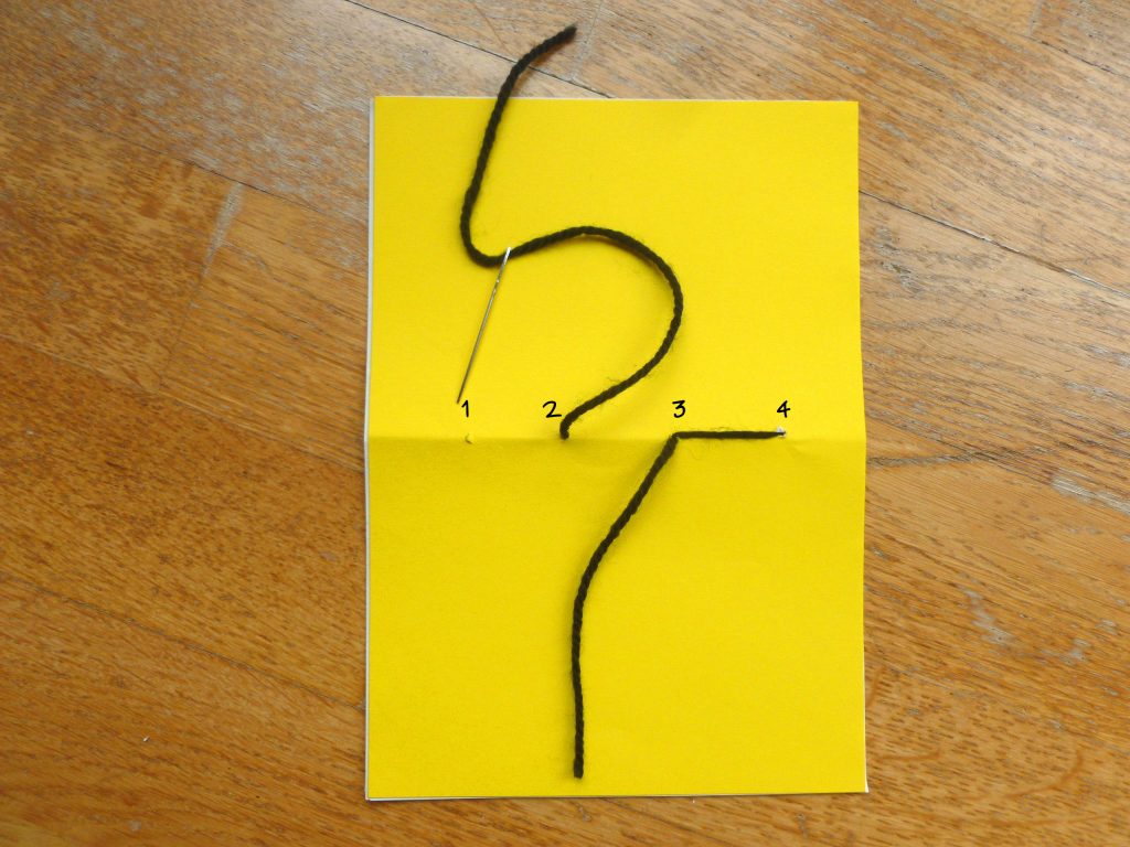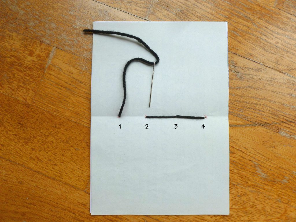 Dann stichst Du bei Loch Nr. 2 wieder nach außen durch.