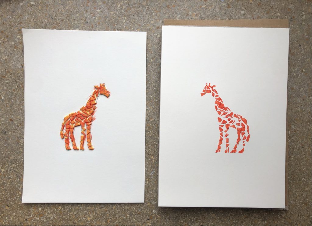 Wenn der Kleber getrocknet ist, könnt Ihr mit dem Pinsel Farbe auf die Schnipsel auftragen und vorsichtig Euer zweites Papier darauflegen. Versucht die Papiere jetzt möglichst nicht mehr hin und her zu bewegen, sondern nur von oben leicht drauf zu drücken, um die Farbe zu übertragen. Die Papiere können danach auseinandergezogen werden.