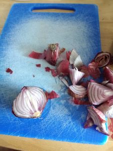 Jetzt sind die Zwiebel Eier dran. Dazu zerkleinert Ihr zwei bis drei rote Zwiebeln. Passt auf Eure Finger auf!