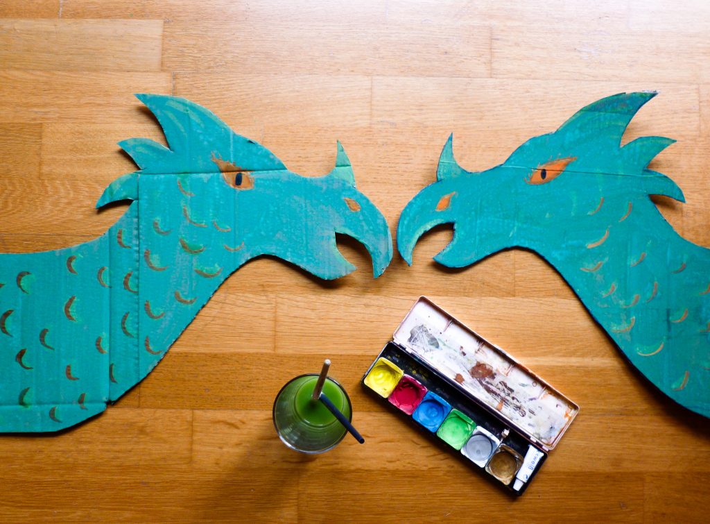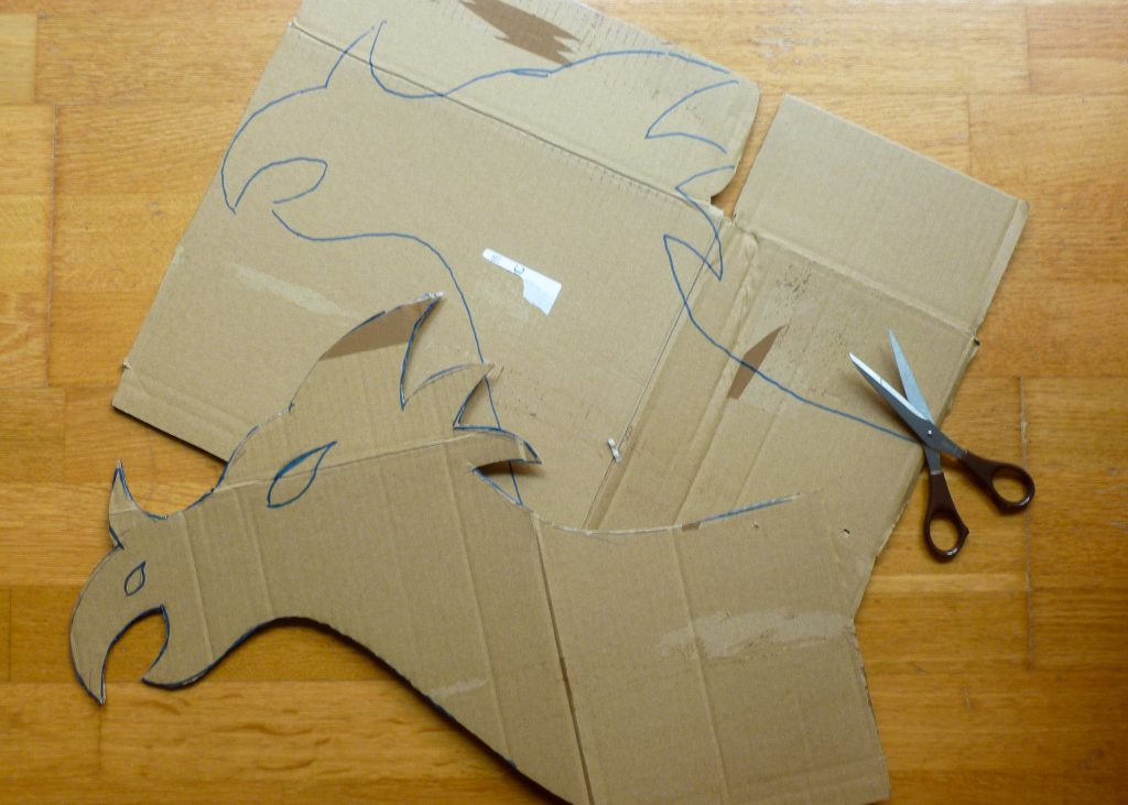 1. Überlegt Euch ein Tier, dass Euch beim Fahrradfahren begleiten soll und einen langen Hals hat. Zeichnet dann den Tierkopf auf den Pappkarton. Nehmt dann den Tierkopf und zeichnet die Form auf den Pappkarton nach, so dass Ihr zwei identische Köpfe habt. Schneidet dann beide Tierköpfe aus.
