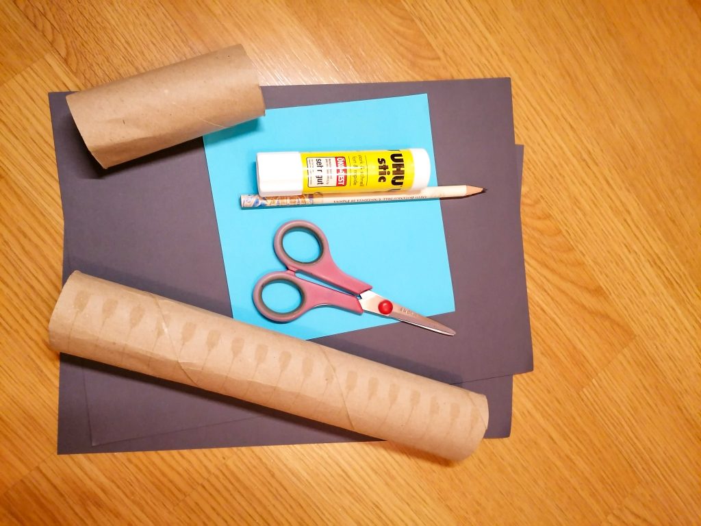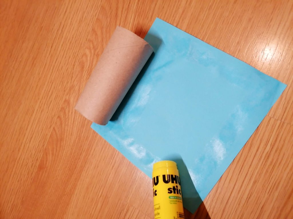 4. Das Gleiche macht Ihr mit dem kleinen Tonpapier und der Klopapierrolle noch einmal. Wenn Ihr merkt, dass zu viel Papier von den Rollen absteht, dann könnt Ihr das noch passend abschneiden.