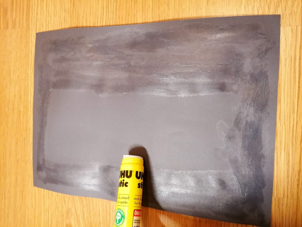 2. Bestreicht das große Tonpapier auf der Seite ohne Malerei mit Kleber. Verwendet nicht zu viel Kleber, damit das Blatt nicht durchweicht.