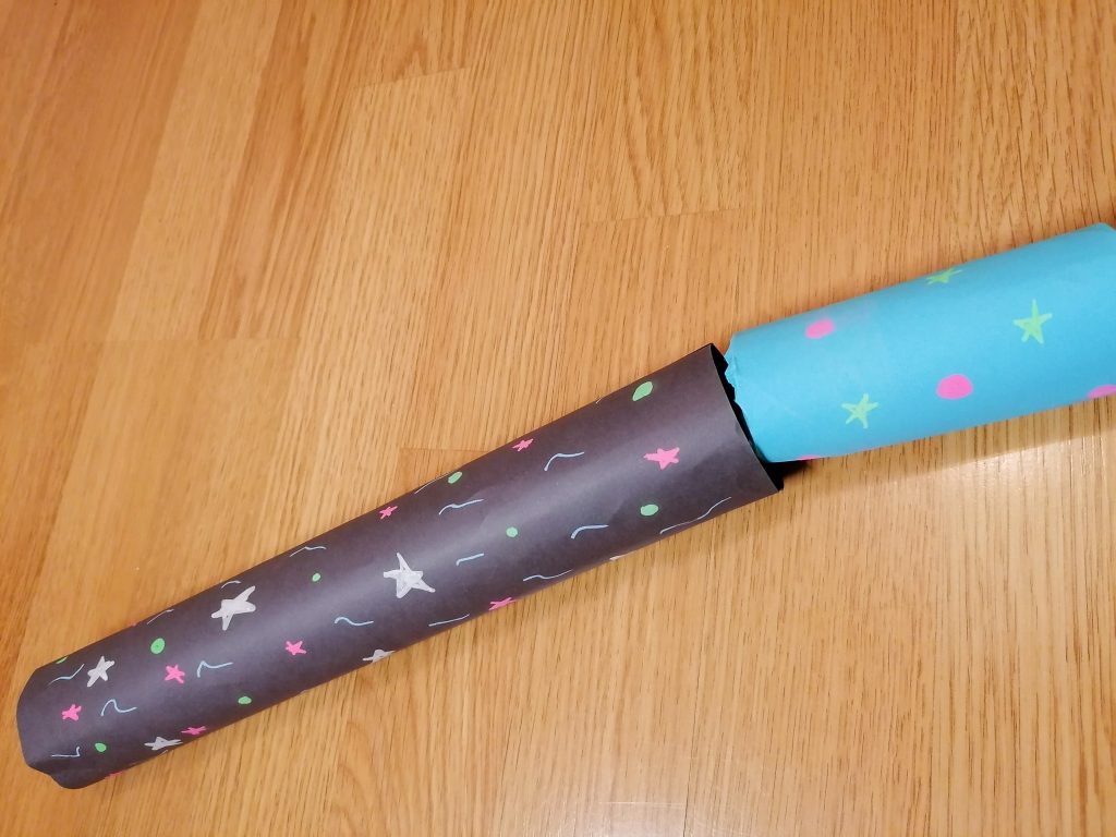 5. Zum Schluss steckt ihr die Klopapierrolle in die Küchenrolle. Ihr solltet die Küchenpapierrolle hin und her schieben können – wie ein ausziehbares Fernrohr.