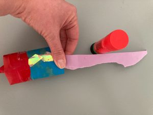 1. Zuerst könnt Ihr die Klopapierrolle ganz nach Eurem Geschmack mit dem Tonpapier bekleben und auch gerne noch weitergestalten. Wichtig ist nur, dass sie nicht zu schwer wird.