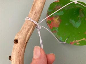 3. Durch beide Löchert könnt Ihr dann die Schnur durchziehen und mit Eurem Holzstock verknoten.
