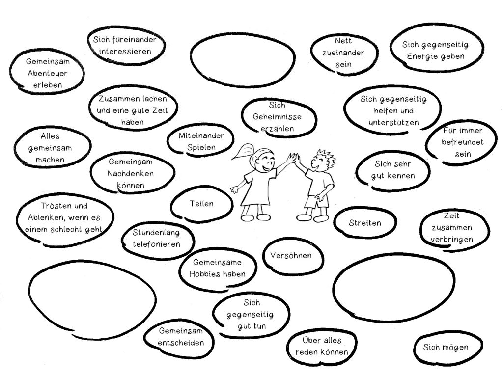Denke jetzt an Deine beste Freundin oder deinen besten Freund. Schau Dir die Begriffe in den Kreisen an und überlege Dir, was auf Eure Freundschaft zutrifft.