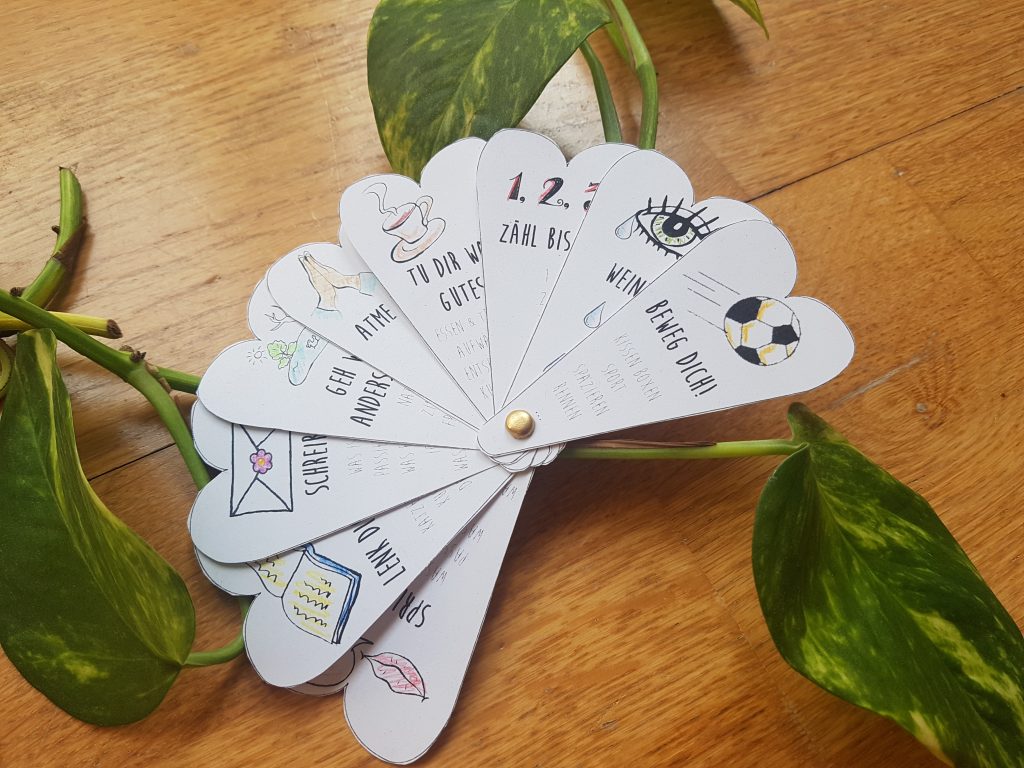 Wenn es Dir das nächste Mal schlecht geht, probier doch mal, ob ein paar dieser Tricks für Dich funktionieren. Damit Du sie gleich zur Hand hast, kannst Du Dir den Frust-Fächer für alle Fälle basteln. Damit kannst Du jeden Frust einfach wegfächern!