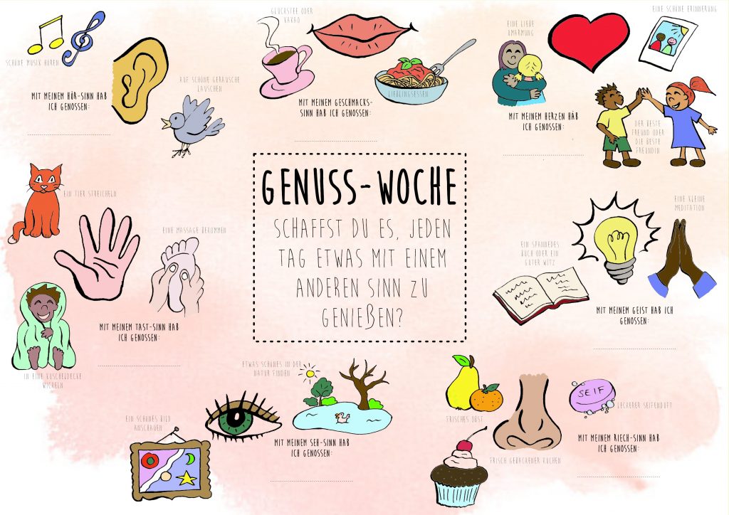 Probier mal, in der kommenden Woche jeden Tag mit einem Sinn richtig zu genießen. Ein paar Ideen findest Du auf unserem Genuss-Plakat, aber natürlich darfst Du Dir noch viel mehr ausdenken.