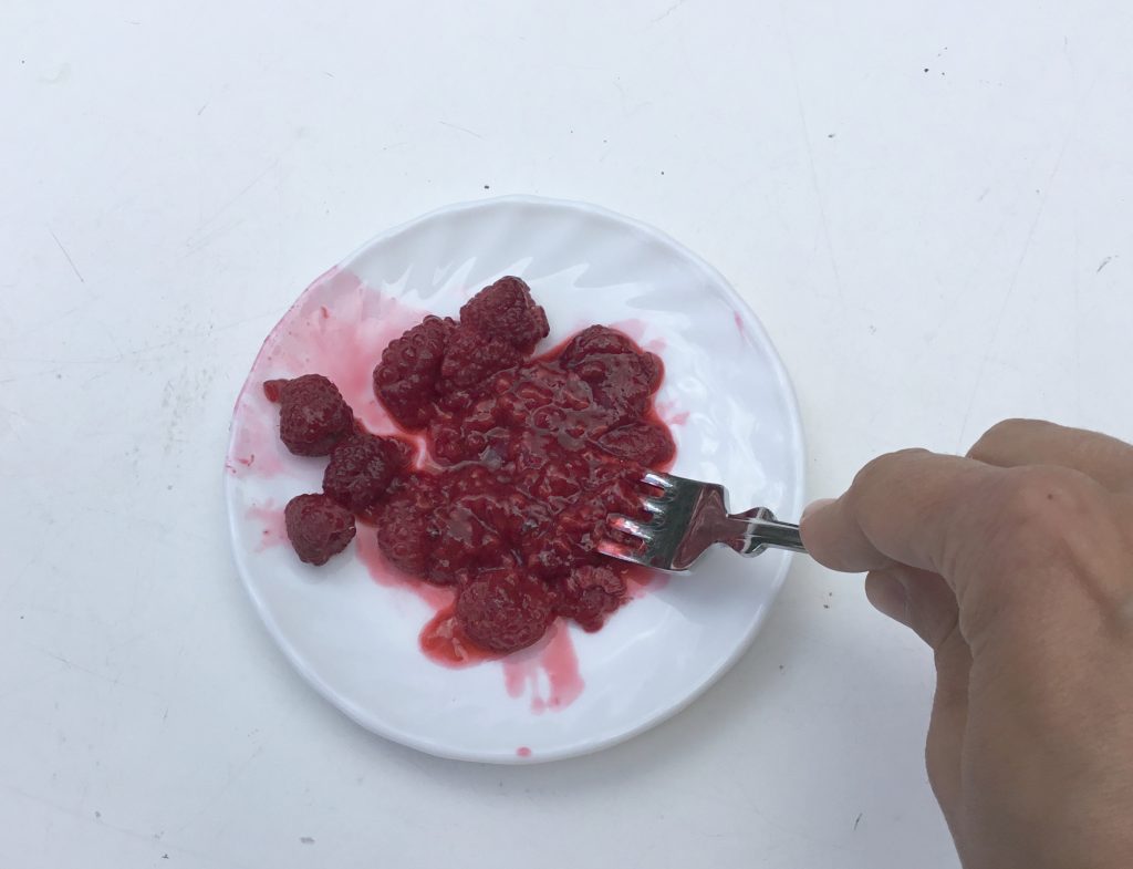 Als erstes zermanschst du die Himbeeren mit einer Gabel zu einem feinen Brei. Den kannst Du gleich schon ins Glas geben.