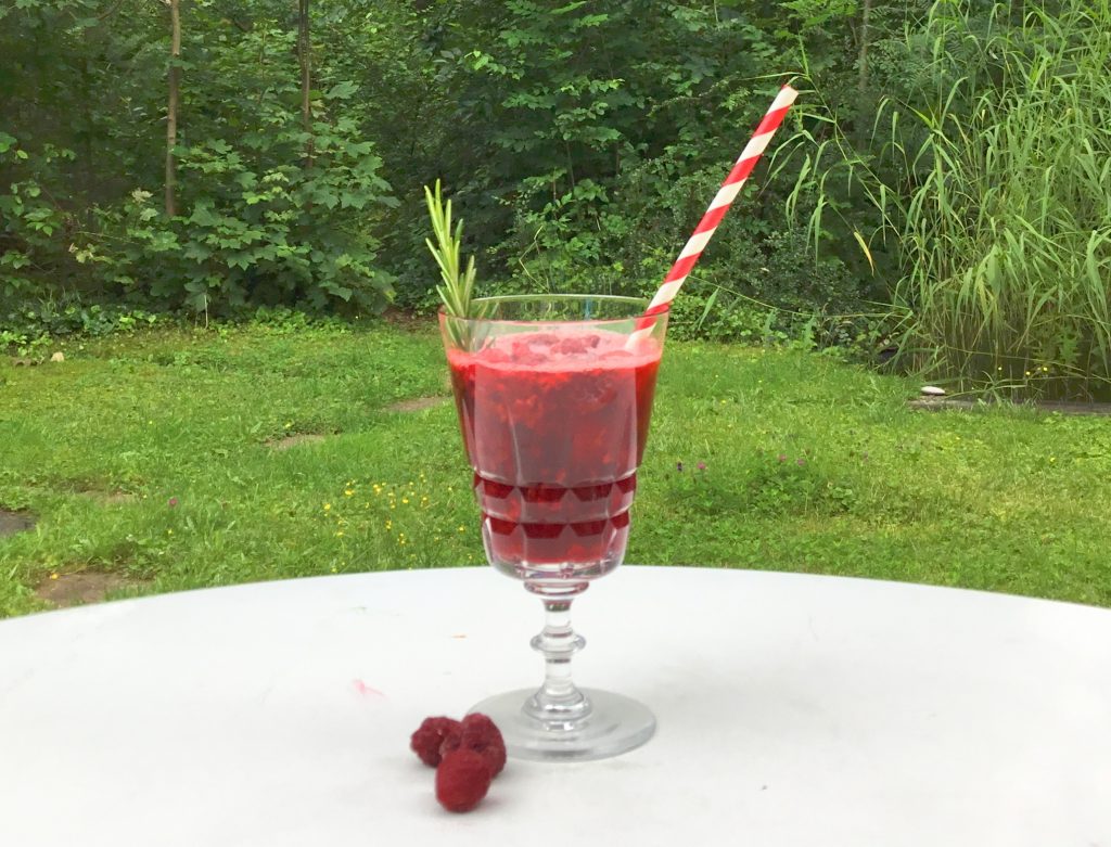 Jetzt musst Du nur noch gut umrühren. Dann kannst Du deine Glückslimo mit gefrorenen Himbeeren und dem Kräuterzweig garnieren und in vollen Zügen genießen!