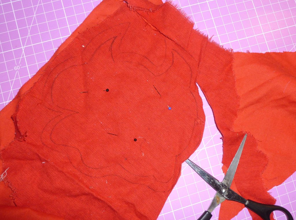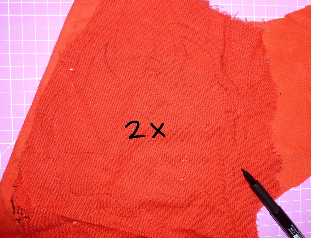 1. Als erstes zeichnest Du den äußeren Umriss deines Monsters zwei mal auf den Stoff. Du kannst Dir Arbeit sparen, wenn Du den Stoff einmal faltest, dann hast Du gleich zwei Lagen übereinander. Zeichne dann eine zweite Linie um die erste, etwa einen halben Zentimeter weiter außen.
