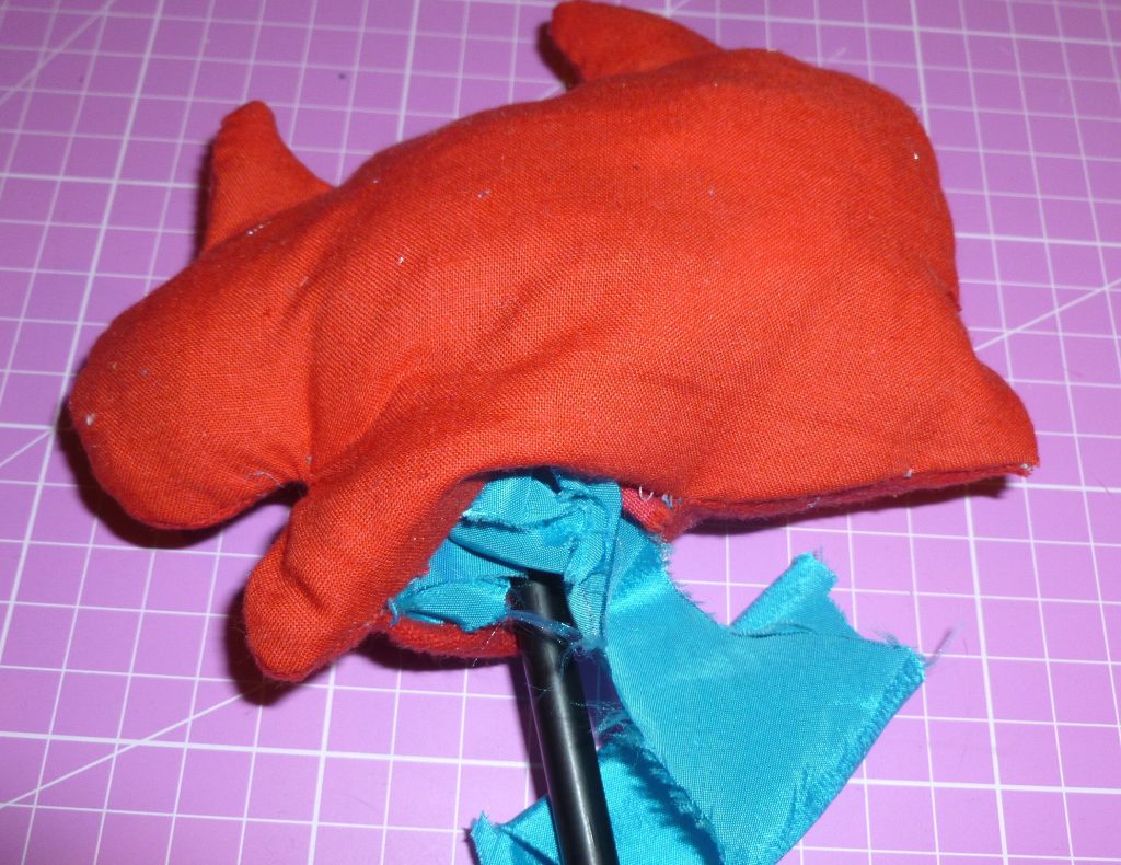 6. Jetzt kannst Du das Monster mit kleinen Stoffschnipseln stopfen. Stopfe erst die Ecken und Wölbungen, dann den Bauch. Wenn Dein Monster dick genug ist, nähst du die Lücke mit kleinen Stichen zu.