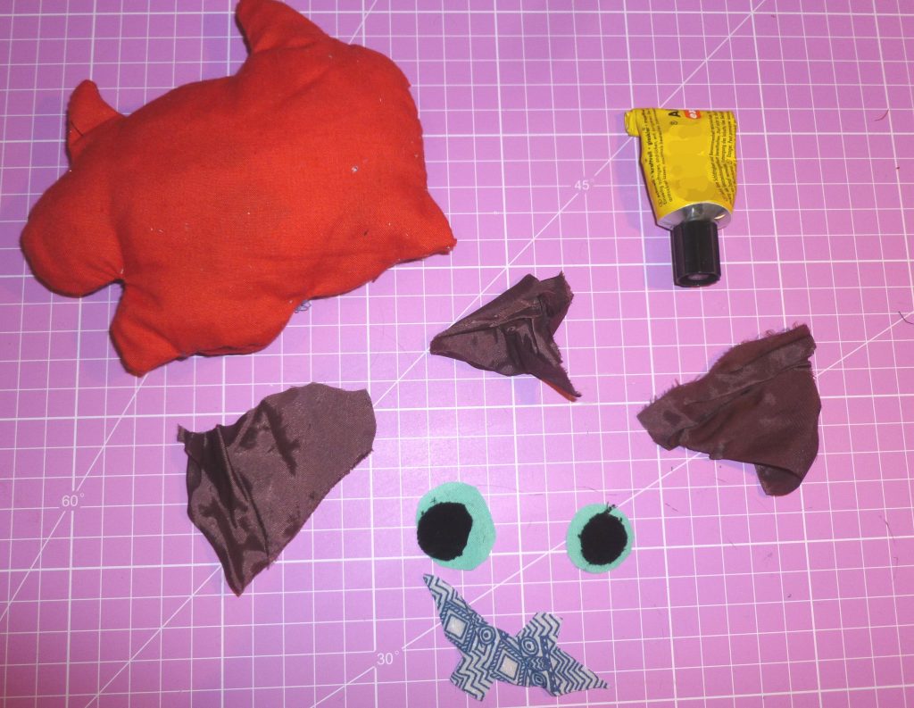- Stoffreste in verschiedenen Farben für den Körper, das Gesicht und zum Stopfen