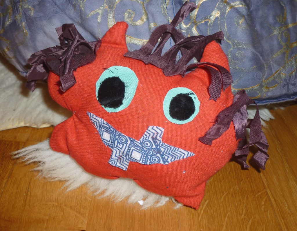7. Jetzt kannst Du Dein Monster noch verzieren und dir ein Gesicht, Haare, Borsten etc. ausdenken. Schneide sie aus Stoffresten aus und klebe sie auf.