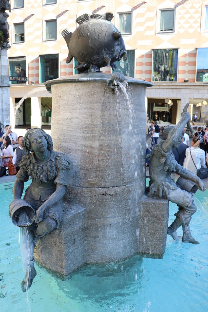 Der Fischbrunnen mitten am Marienplatz ist ein beliebter Treffpunkt. Sieht man genauer hin, erkennt man an seinen Mauern Marktszenen einer längst vergangenen Zeit. Früher standen rund um den Brunnen die Fischweiber, die das Wasser nutzen, um ihren Fisch kühl zu halten.