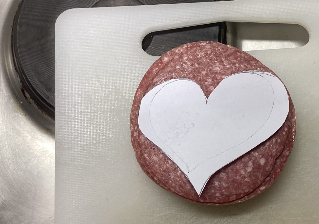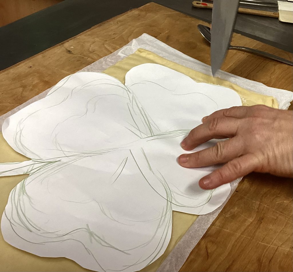 Male jetzt auf das Backpapier für den Teig ein großes Kleeblatt und für den Käse sowie für die Salami jeweils Herzen.