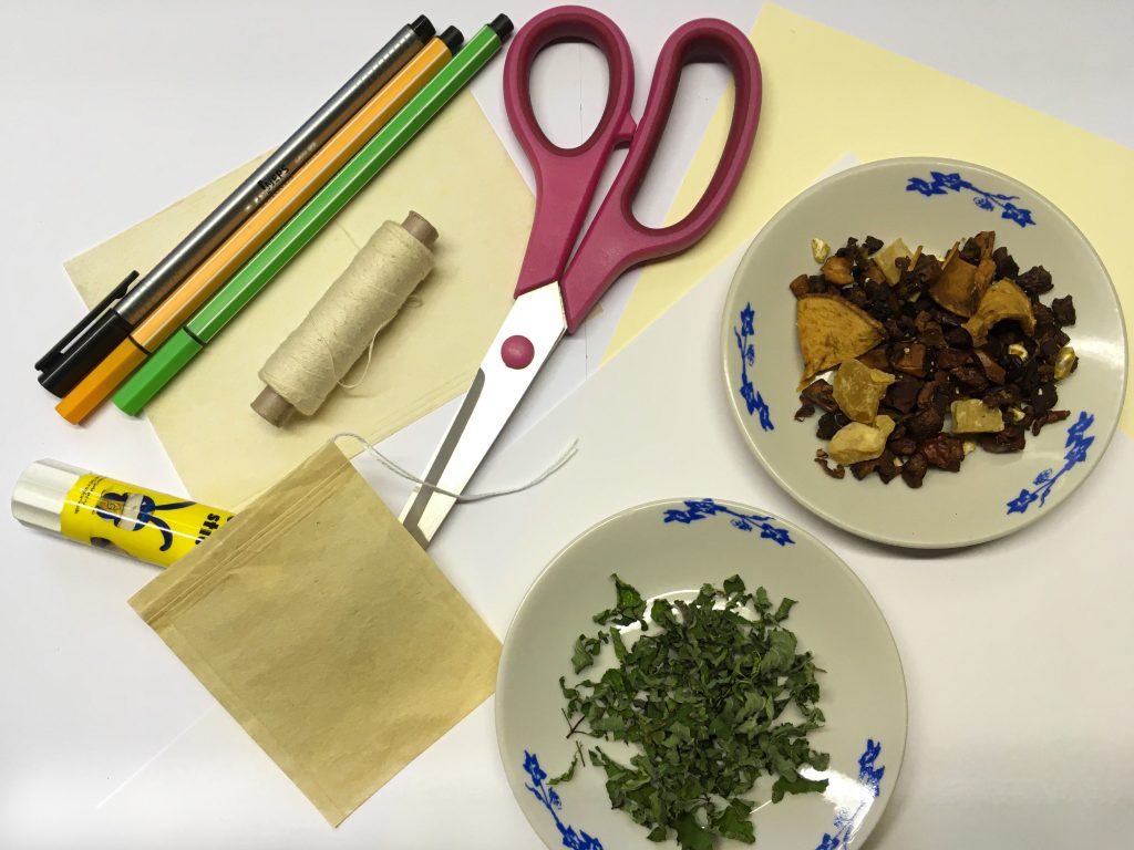 - befüllbare Teebeutel + Baumwollfaden (falls die Teebeutel ohne Faden sind)