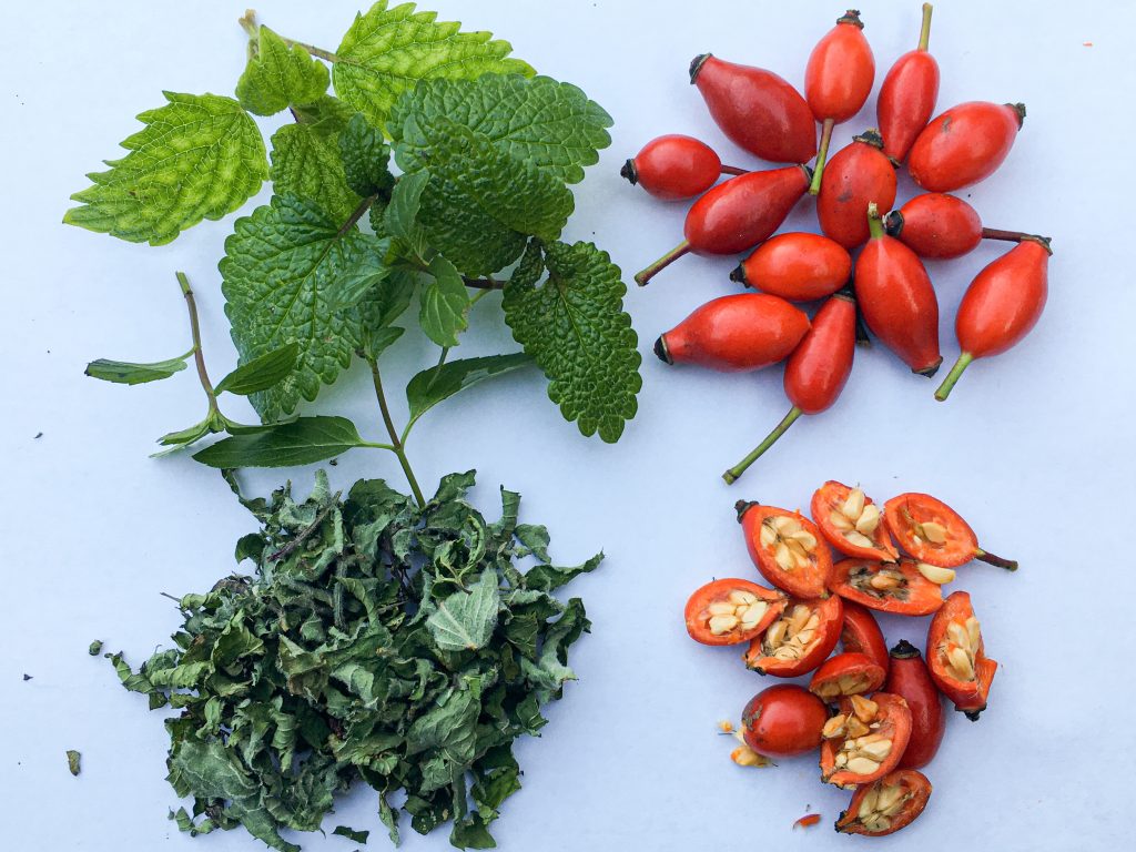 Im Sommer kann man für den Kräutertee z.B. Pfefferminze, Zitronenmelisse oder auch Brennessel selbst trocknen, im Herbst z.B. Hagebutten.