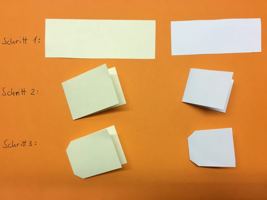 Aus Papier einen länglichen Anhänger ausschneiden (ca. 3,5 x 10 cm – oder kleiner oder größer) und in der Mitte falten, an der gefalteten Kante kleine Ecken abschneiden.