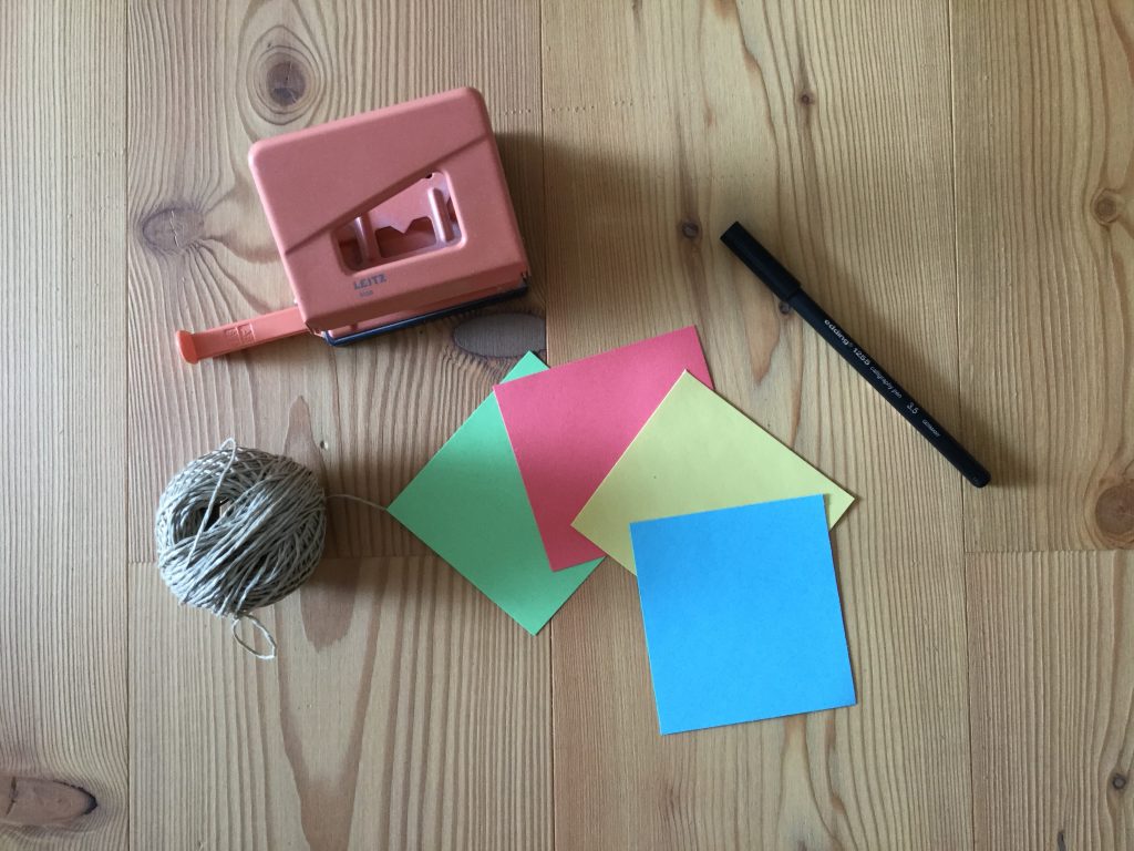 Mit dem Locher machst Du oben Löcher in die Blätter und fädelst jedes Blatt auf deine Schnur.