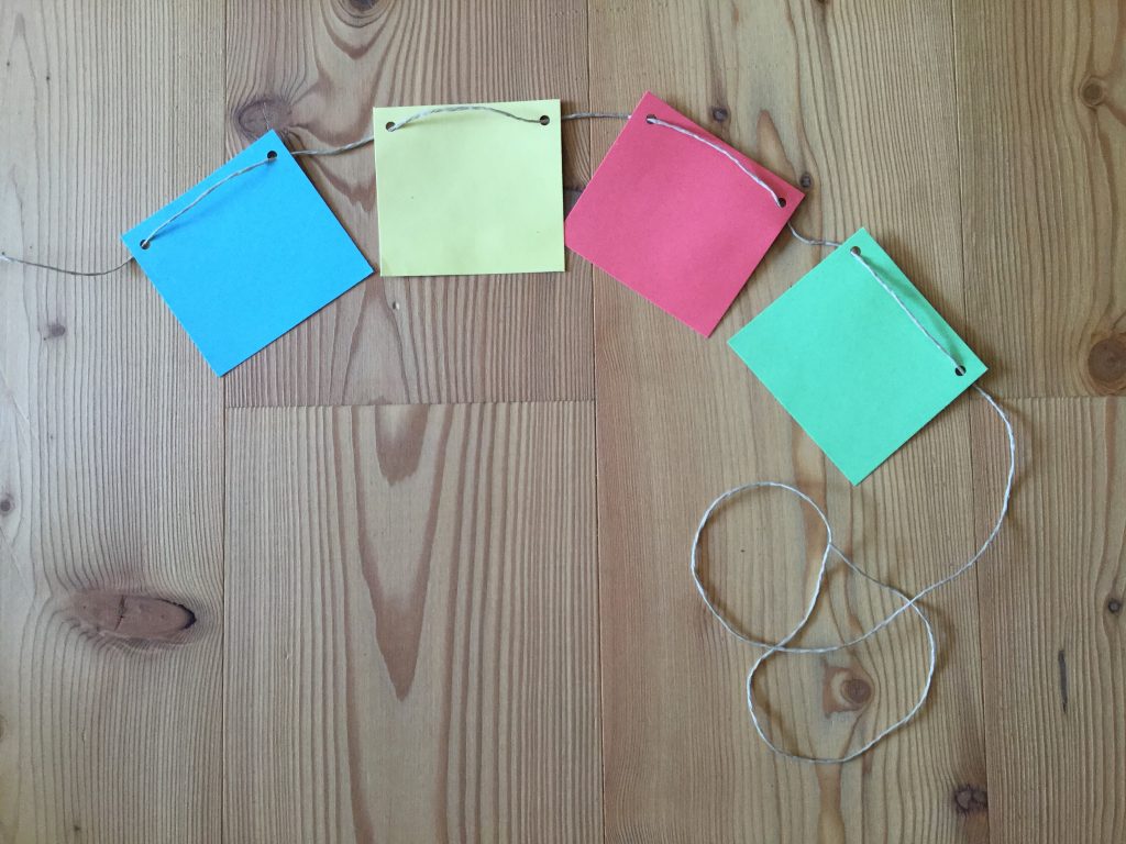Vielleicht hast Du solche Fahnen schon einmal gesehen. Die Idee kommt von den Gebetsfahnen im tibetischen Buddhismus. Die Tibeter schreiben Gebete auf die einzelnen Stofffahnen und hängen sie in die Natur. Die Vorstellung ist, dass der Wind die Gebete zu allen Menschen trägt, die sie jetzt gebrauchen können. Natürlich kannst auch Du Deine Glückwunsch-Fahne nach draußen hängen. Dann ist es aber besser, wenn Du Stoff statt Papier verwendest und einen wasserfesten Stift. Viel Glück!