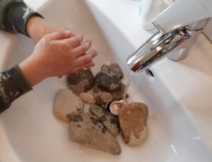 Zu Hause angelangt, durften die Steine erst einmal eine heiße Dusche in unserem Waschbecken nehmen- das fanden sie toll, sie sangen Steine Lieder und plantschten wild herum und wollten gar nicht mehr raus aus dem Becken.