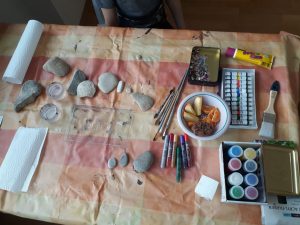 Mit vielen Pinseln, Acrylfarben, Glitzerstiften, Kleber, Pailletten…eben allem, was wir so finden konnten, machten wir uns daran, unsere quirligen Steine hübsch anzumalen.