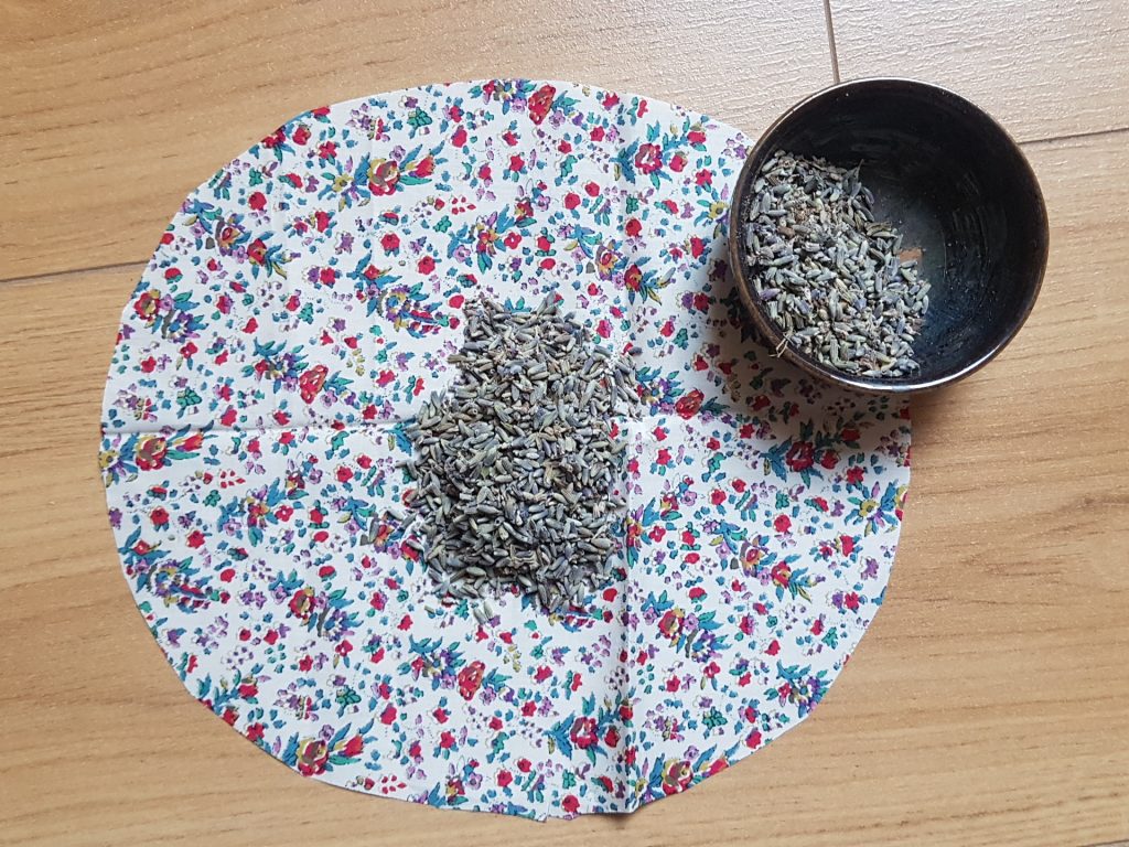 Falte Deinen Stoffkreis auf und gib etwa 2 EL Lavendelblüten in die Mitte des Stoffes.
