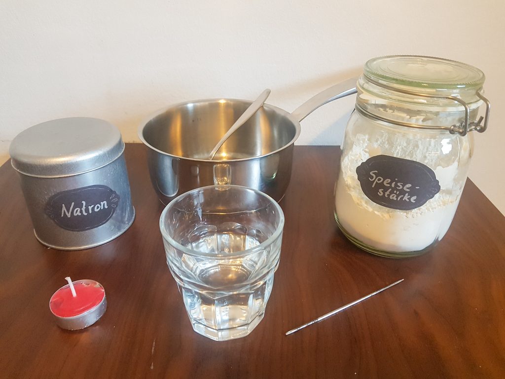 1. Für die Knetmasse mischt Ihr Natron und Speisestärke in dem Topf. Gießt vorsichtig das Wasser dazu.
