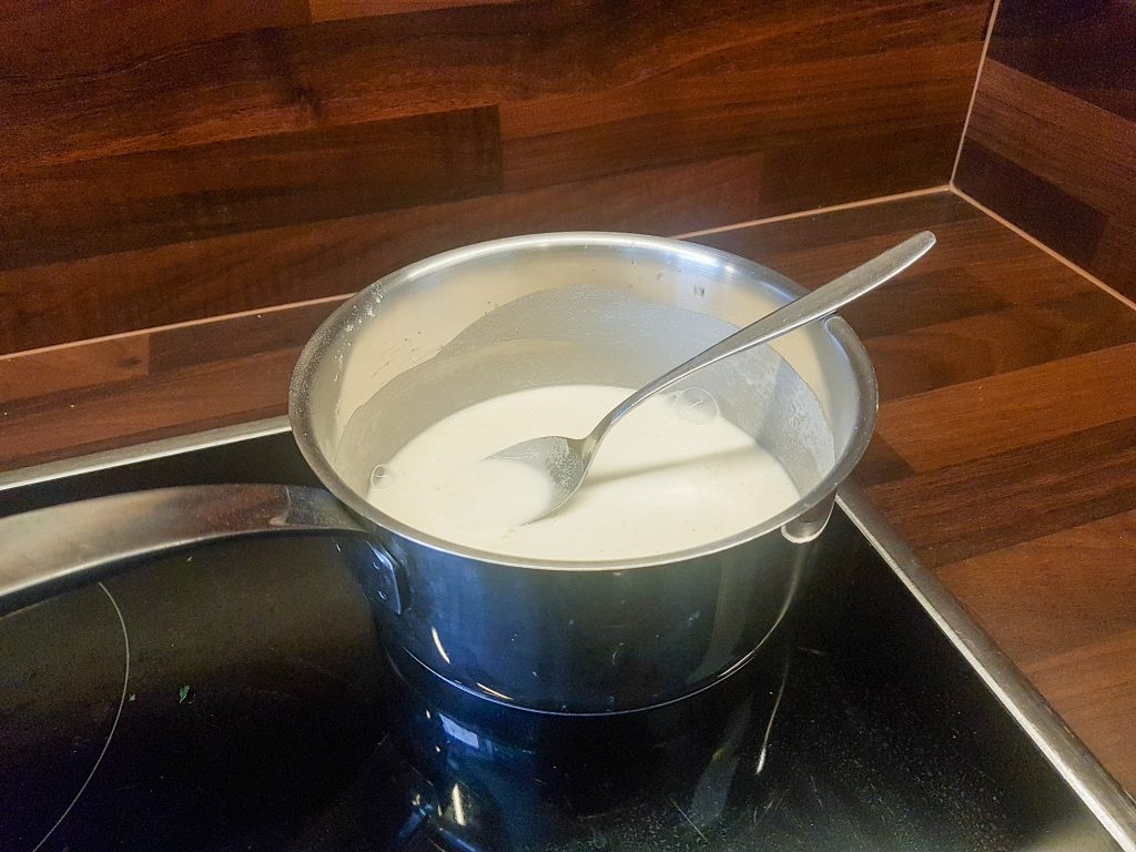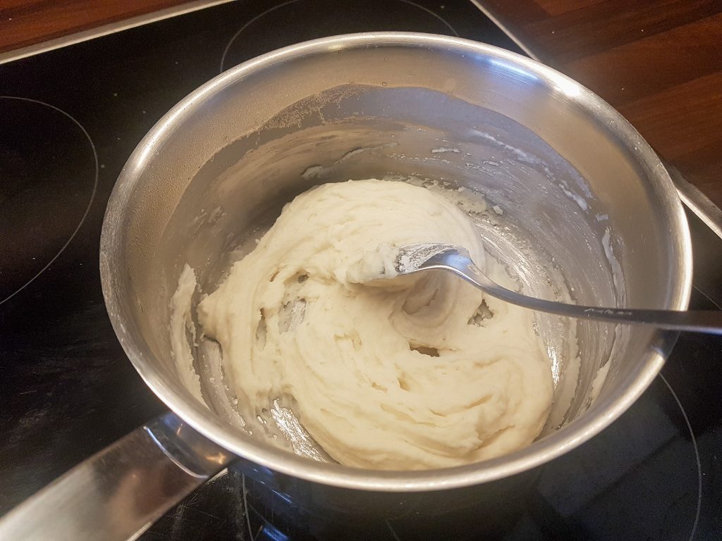2. Jetzt lasst Ihr Euch am besten von jemand Älteren helfen: Stellt den Topf bei geringer Hitze auf den Herd und rührt, so lange bis aus der Flüssigkeit eine feste Masse geworden ist, wie ein weicher Plätzchenteig. Lasst die Masse dann gut abkühlen.