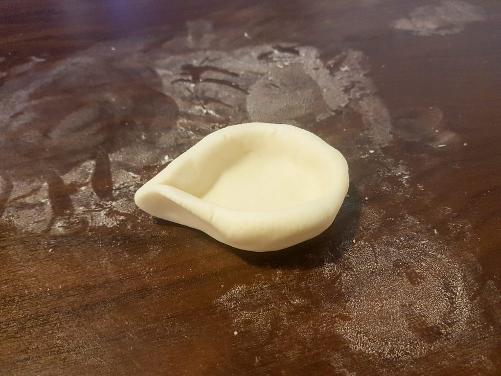 4. Formt aus dem größeren Teil eine kleine Schüssel. Gebt der Schüssel an einer Seite eine kleine “Nase”.