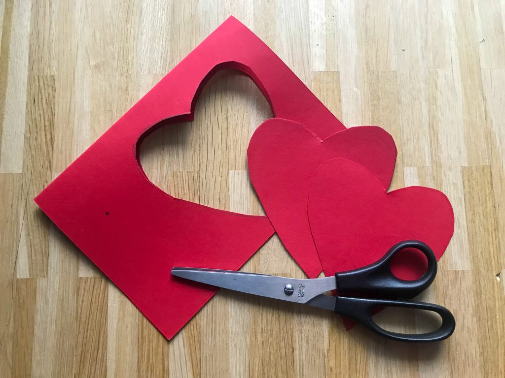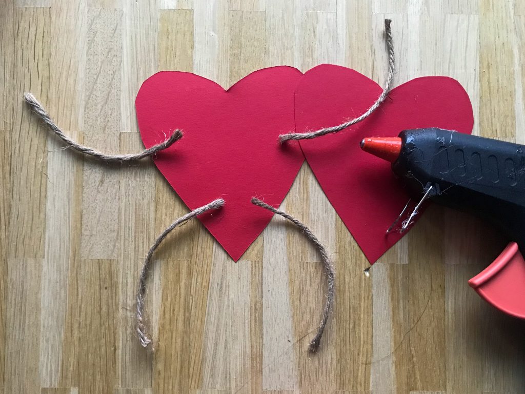 1. Schneide als erstes aus Filz oder Tonpapier zwei identische Herzen, die ca. 12 cm sind, aus.