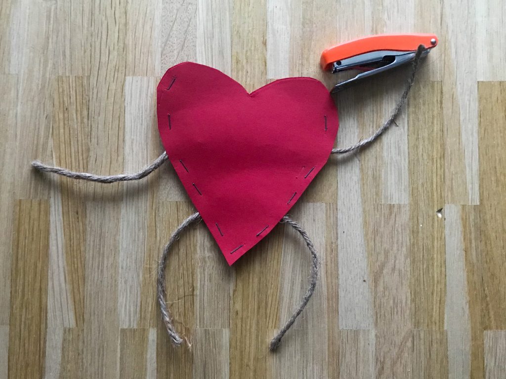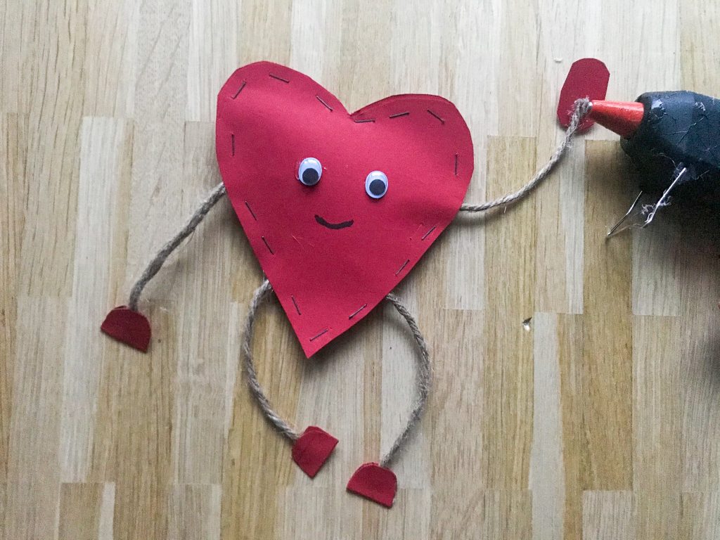 4. Im nächsten Schritt ist das Gesicht der Herzfigur dran. Dafür können zum Beispiel Wackelaugen verwendet werden. Man kann aber natürlich auch alles selbst aufzeichnen und kleben.