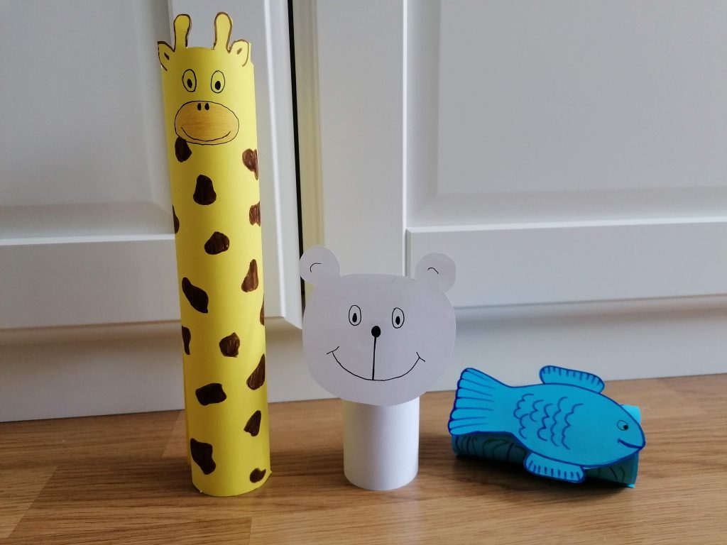 Bastelt Euch ganz einfach aus Klopapierrollen Eure eigenen Tiere. Dazu braucht Ihr nur ein paar Klopapier- oder Küchenpapierrollen, buntes Papier, eine Schere, Stifte und dann kann es auch schon losgehen. In diesem Bild findet Du z.B. eine Giraffe, einen Fisch und einen Eisbär. Und jetzt seid Ihr dran: Baut Eure eigene Tierwelt! Viel Spaß!