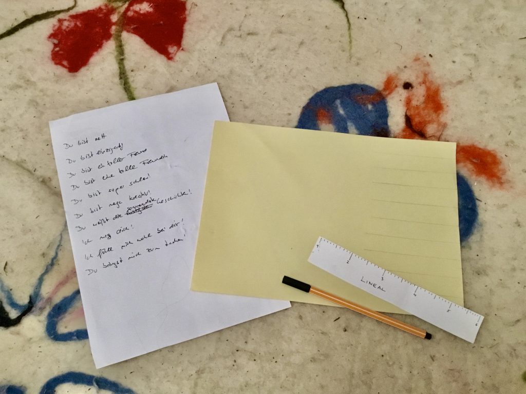Als erstes denkst Du Dir ein paar nette Komplimente aus und notierst sie auf dem Schmierpapier.