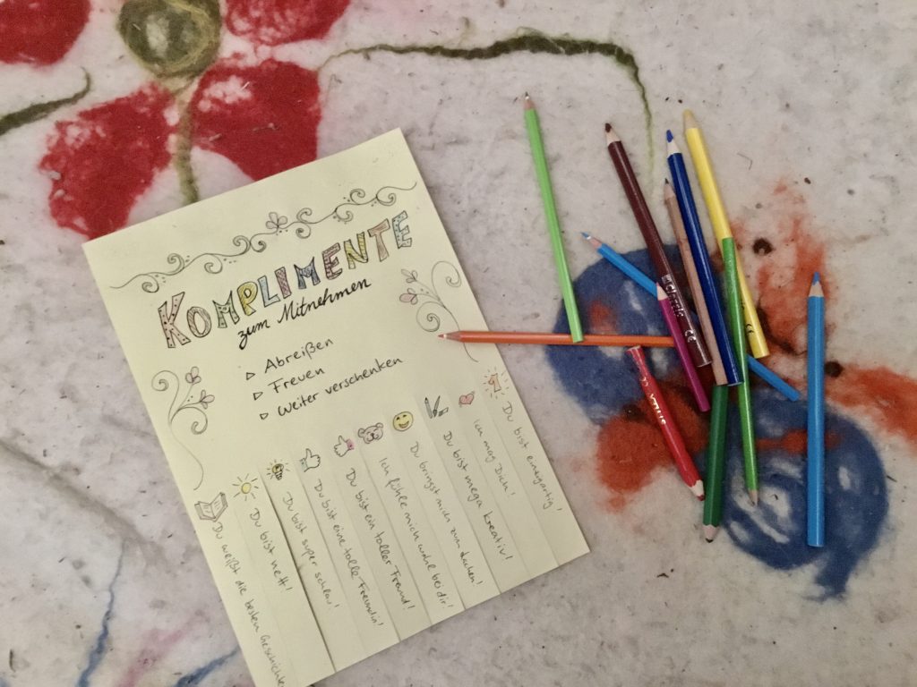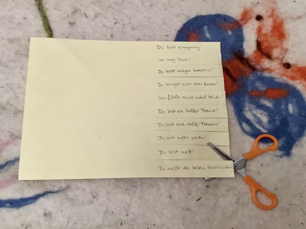 Schreibe die Komplimente in die markierten Abschnitte und schneide an den Markierungen entlang, so dass kleine Abreiß-Zettelchen entstehen.